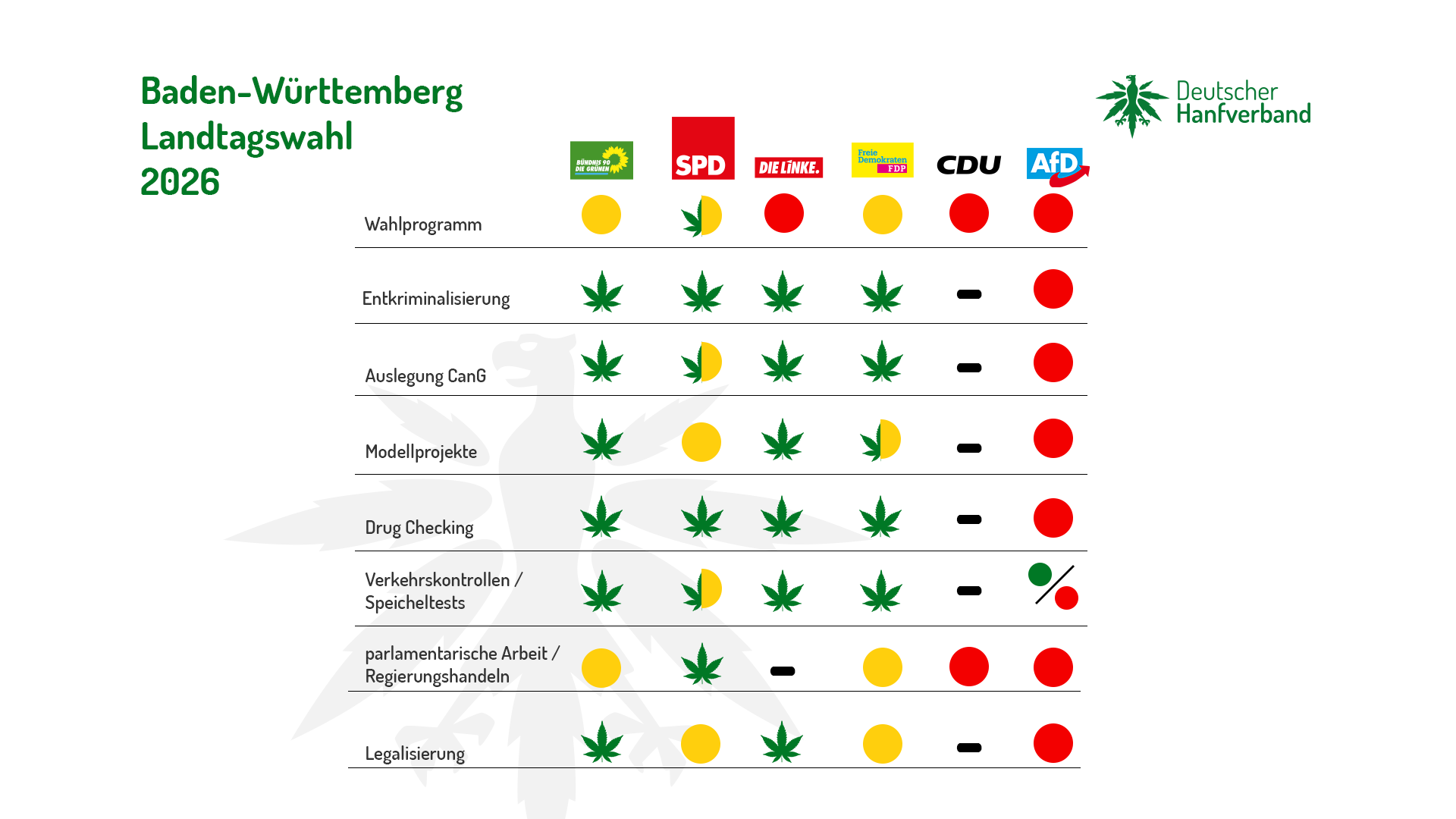 Der Deutsche Hanfverband vertritt die Interessen der Cannabiskonsumenten und Legalisierungsbefürworter. Wir streben einen legalen, verbraucherfreundlichen Markt für das Genussmittel Cannabis an – von der Produktion bis zum Verkauf in Fachgeschäften für Erwachsene. Wir wollen jede Form von Diskriminierung beenden und kämpfen für sinnvolle Regeln u.a. in den Bereichen Führerschein, Besitz, Konsum, Eigenanbau, Anbauvereine und Medizin.