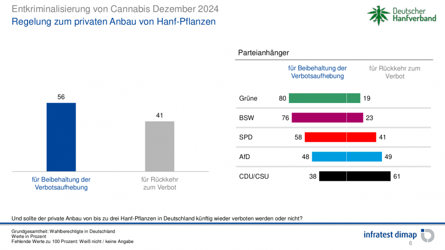 Noch absurder mutet dieses Unvermögen angesichts der Meinung innerhalb der eigenen Wählerschaft an. Laut einer Umfrage des Meinungsforschungsinstituts infratest dimap vom Dezember letzten Jahres befürworten 79% der BSW-Wähler den legalen Besitz geringer Mengen von Cannabis und 76% den legalen privaten Eigenanbau von Cannabis.