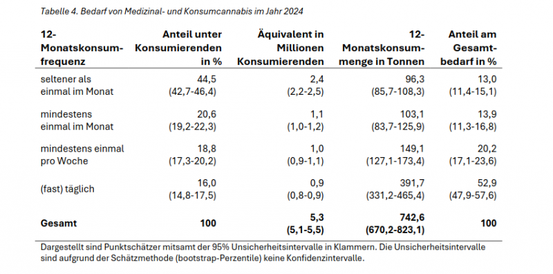 Anschließend wurde für die geschätzte Gesamtzahl von Konsumierenden (5,5 Mio. Erwachsene) je nach Konsumhäufigkeit und ermittelten monatlichen Durchschnittsverbrauch ein Gesamtbedarf von 743 Tonnen Medizinal- und Konsumcannabis (Unsicherheitsintervall: 670 bis 823 Tonnen) in Deutschland für die Altersgruppe 18+ errechnet.