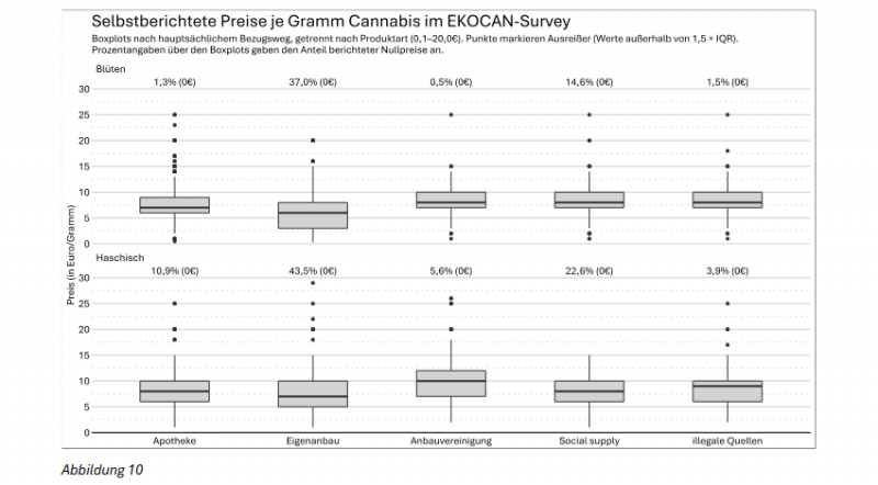 Einen möglichen Grund für diese Verschiebung des Marktes zugunsten der legalen Ursprungsquellen liefern die Forscher ebenfalls mit. Vergleicht man die Kosten für Cannabis je nach Ursprungsquelle, so schneiden die beiden legalen Quellen Eigenanbau und Apotheke am günstigsten ab. Anbauvereinigungen, Social Supply (keine Ursprungsquelle) und illegale Quellen liegen ungefähr gleichauf. Daraus schließen die Autoren, “dass die gegenwärtige Preisstruktur den Bezug von Cannabis aus legalen Quellen, insbesondere aus Eigenanbau, aber auch aus Apotheken, begünstigt.”