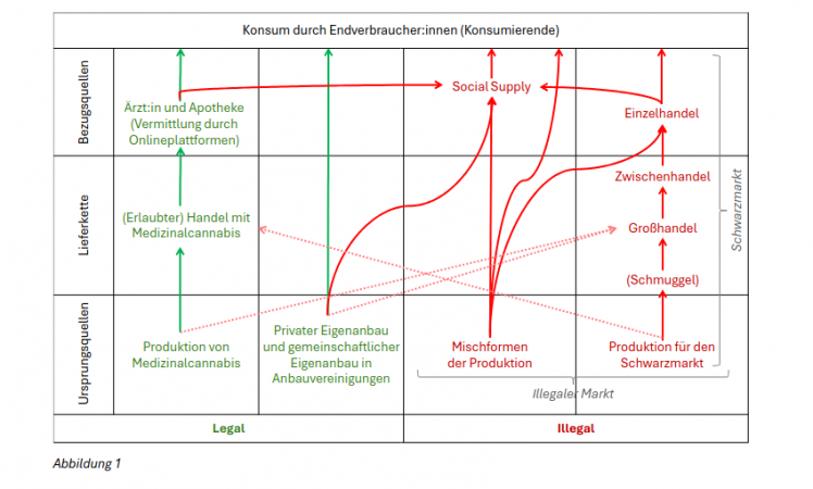 Für Konsumcannabis gibt es mit Ausnahme der Abgabe über Anbauvereinigungen aktuell keine weitere legale Form des Handels bzw. der Abgabe. Für Medizinalcannabis hingegen besteht ein legaler Markt mit bestimmten Zugangsvoraussetzungen (z.B. eine ärztliche Verschreibung). Für den illegalen Markt schlagen die Forscher eine in der Logik des Gesetzes sinnvolle Differenzierung in “Social Supply” und Schwarzmarkt vor: