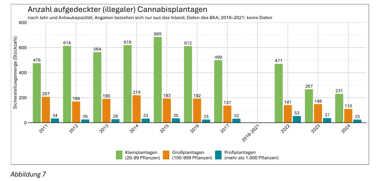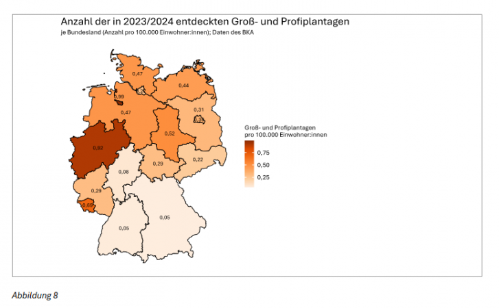 Hinsichtlich der Produktionskapazitäten zeigt sich, dass Profi- und Großplantagen trotz deutlich geringer Anzahl an Aufdeckungen für einen maßgeblichen Teil der bekannten inländischen illegalen Cannabisproduktion verantwortlich sind.