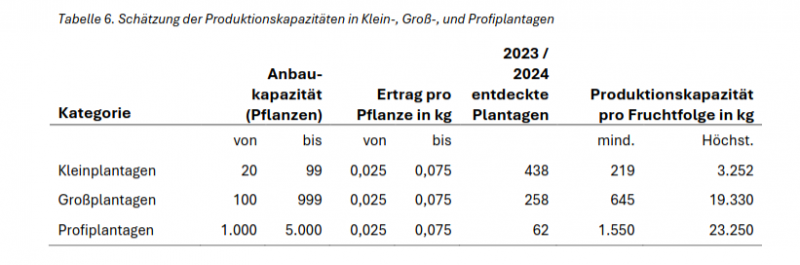 Der Großteil der in Deutschland aufgedeckten illegalen Plantagen sind Kleinplantagen bis zu 99 Pflanzen. Bei diesen gehen die Forschenden davon aus, dass es sich eher um Mischformen der Produktion handelt, die keine eindeutige Einordnung zum Schwarzmarkt zulassen und die Erzeugung auch zur Deckung des eigenen Bedarfs oder der Weitergabe als Social Supply dient. Bei Groß-und Profiplantagen hingegen kann davon ausgegangen werden, dass diese maßgeblich für den Schwarzmarkt produzieren.
