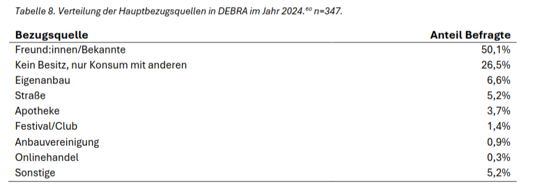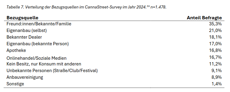 Die Forscher betonen, dass auf Grundlage dieser beiden Befragungen Social Supply die “wohl wichtigste Bezugsquelle” darstellt und nur “wenige Konsumierende […] für den Bezug von Cannabis in den direkten Austausch mit sog. Einzelhändler:innen des Schwarzmarkts” treten”. Ebenfalls scheinen Apotheken eine relevante Bezugsquelle darzustellen, wobei nicht klar ist, ob dies ausschließlich zu medizinischen Zwecken verwendet wird.