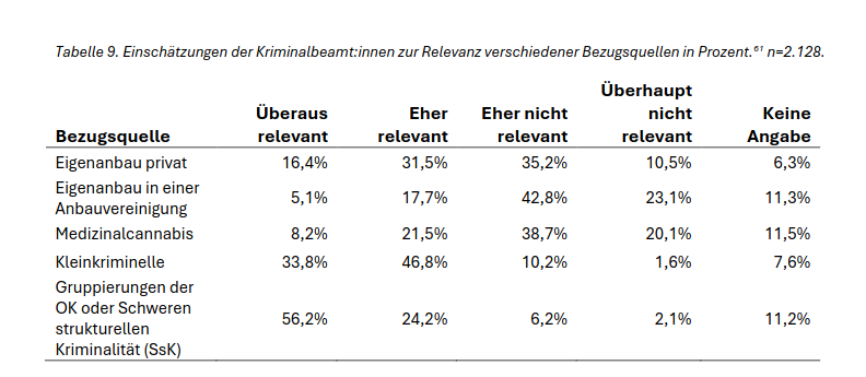 Zur Relevanz verschiedener Bezugsquellen wurden ebenfalls die Einschätzungen von Kriminalpolizisten abgefragt. Hier zeigte sich, dass ein Großteil der Befragten vor allem im kriminellen Milieu eine hohe Relevanz vermutet. Dies liege wahrscheinlich daran, dass bei den Polizisten die persönlichen Erfahrungen maßgeblich durch ihren beruflichen Alltag geprägt sind: “Insbesondere Bezugswege, die auf privaten Beziehungen beruhen, dürften der Polizei seltener bekannt werden als etwa der illegale Handel von Cannabis unter Fremden, z. B. über das „Dealen“ auf der Straße.”