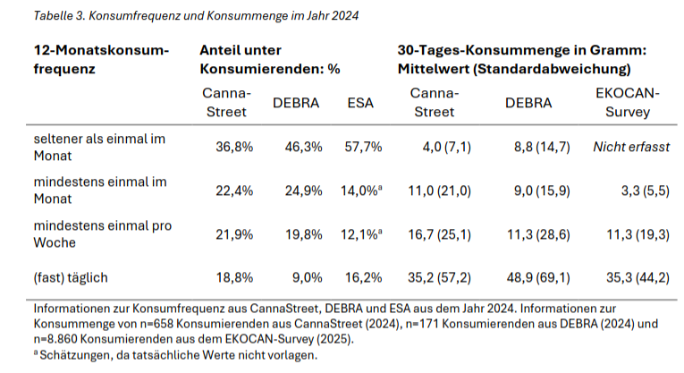 Damit liegt diese neue Schätzung deutlich über dem Wert von knapp 400 Tonnen, den der Ökonom Justus Haucap 2021 errechnet hatte. Ursache dafür sind einerseits eine höhere Konsumprävalenz (10,5% vs. 7,1%) und andererseits höhere durchschnittliche Konsummengen, die über die aktuellen Umfragen ermittelt wurden. Haucap hatte in diesem Zusammenhang Daten aus Colorado nach der dortigen Legalisierung samt Fachgeschäften genutzt.