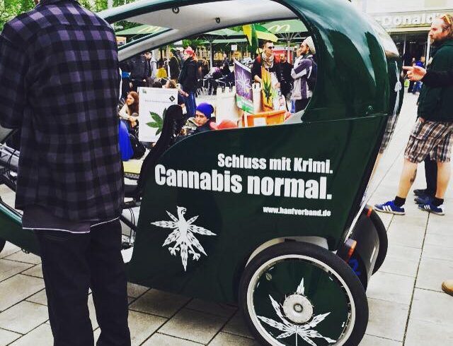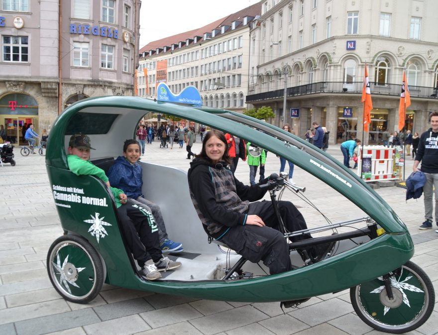 Auch bei den beiden Veranstaltungen zum Global Marijuana March am 02. und am 09. Mai in der alten Handelsmetropole Augsburg war die Rikscha mit vor Ort und lockte die Blicke vieler Passanten auf sich.
