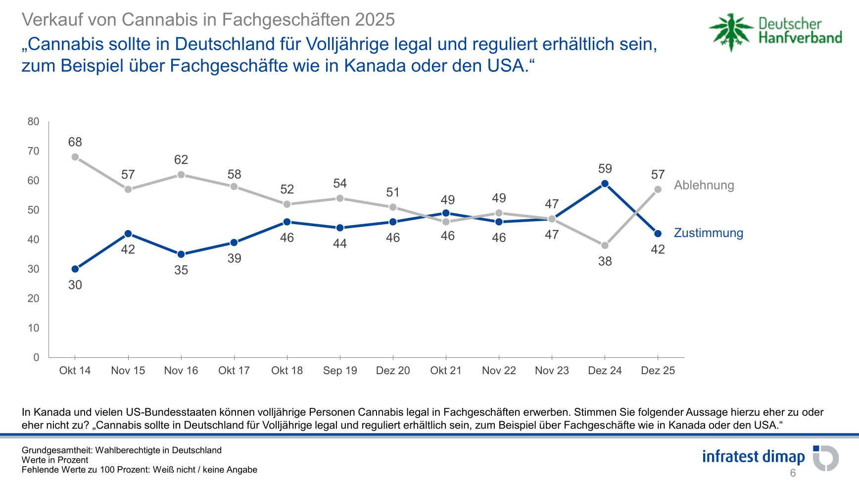 Der Deutsche Hanfverband hat über die Jahre Umfragen bei verschiedenen Meinungsforschungsinstituten in Auftrag gegeben, um die Einstellung der Bevölkerung zu verschiedenen Cannabis bezogenen Themen und im Besonderen auch der Legalisierung in Erfahrung zu bringen. Die Umfragen wurden je nach Anbieter online oder klassisch als Telefonumfrage durchgeführt. Insbesondere die Umfragen von infratest dimap zeigen die Entwicklung von 30% Zustimmung zur Legalisierung in 2014 bis zur ersten einfachen Mehrheit (49%) 2021 und schließlich zur absoluten Mehrheit (59%) 2024. Hier findet ihr eine Übersicht zu allen vom DHV in Auftrag gegebenen Studien.
